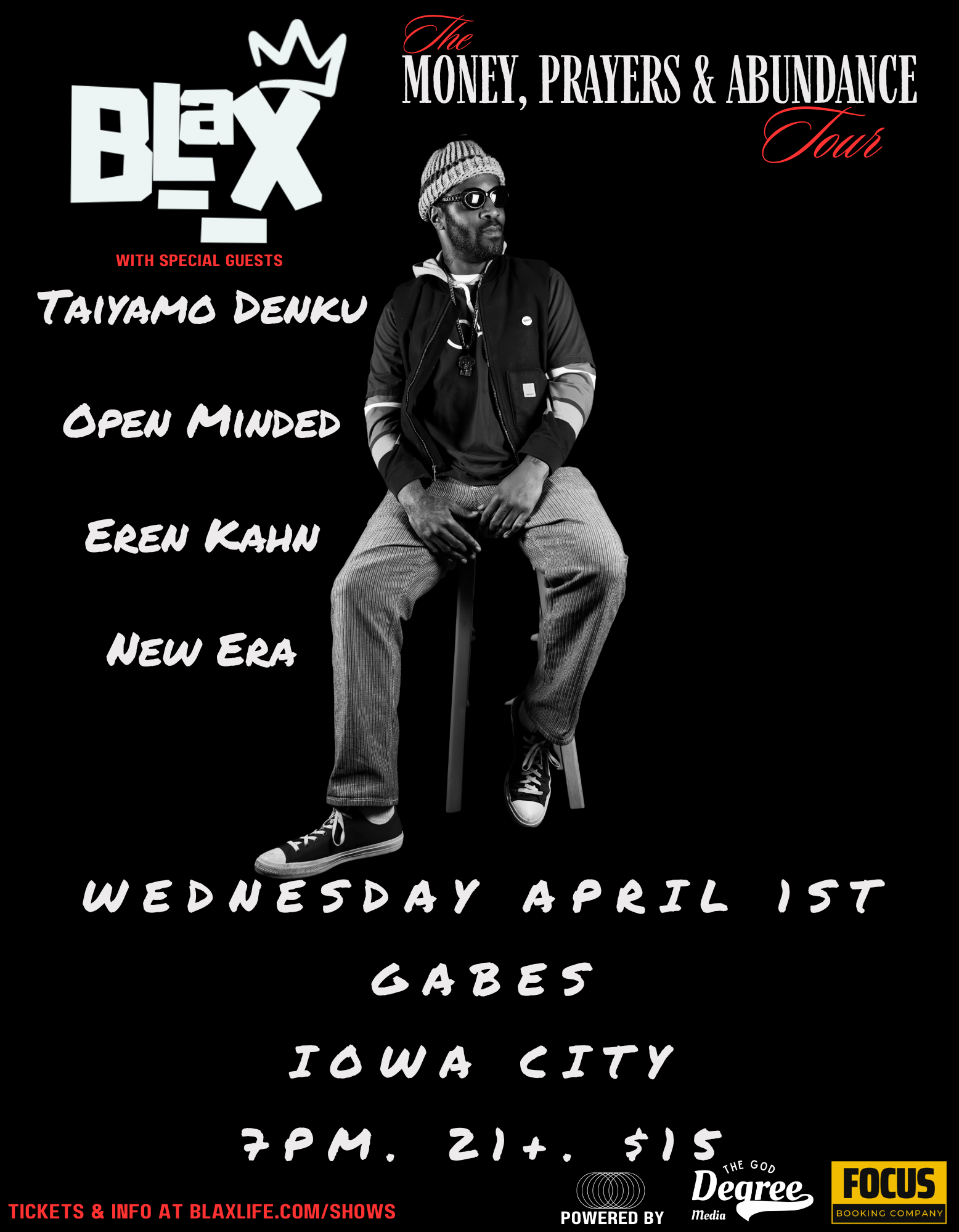 Iowa City’s legendary Gabe’s hosts Milwaukee’s BLAX with a stacked lineup. BLAX brings Omnipotent Methodology – 16 tracks of conscious hip-hop blending jazz and soul with street awareness, representing years of independent artistry. A 2018 WAMI Award winner featured in The Fader, The Source, and Respect Magazine, BLAX tours on his own terms, owning all masters and publishing through God Degree Media. Stop ten of the 15-city Money Prayers & Abundance Tour. Limited tour vinyl available.