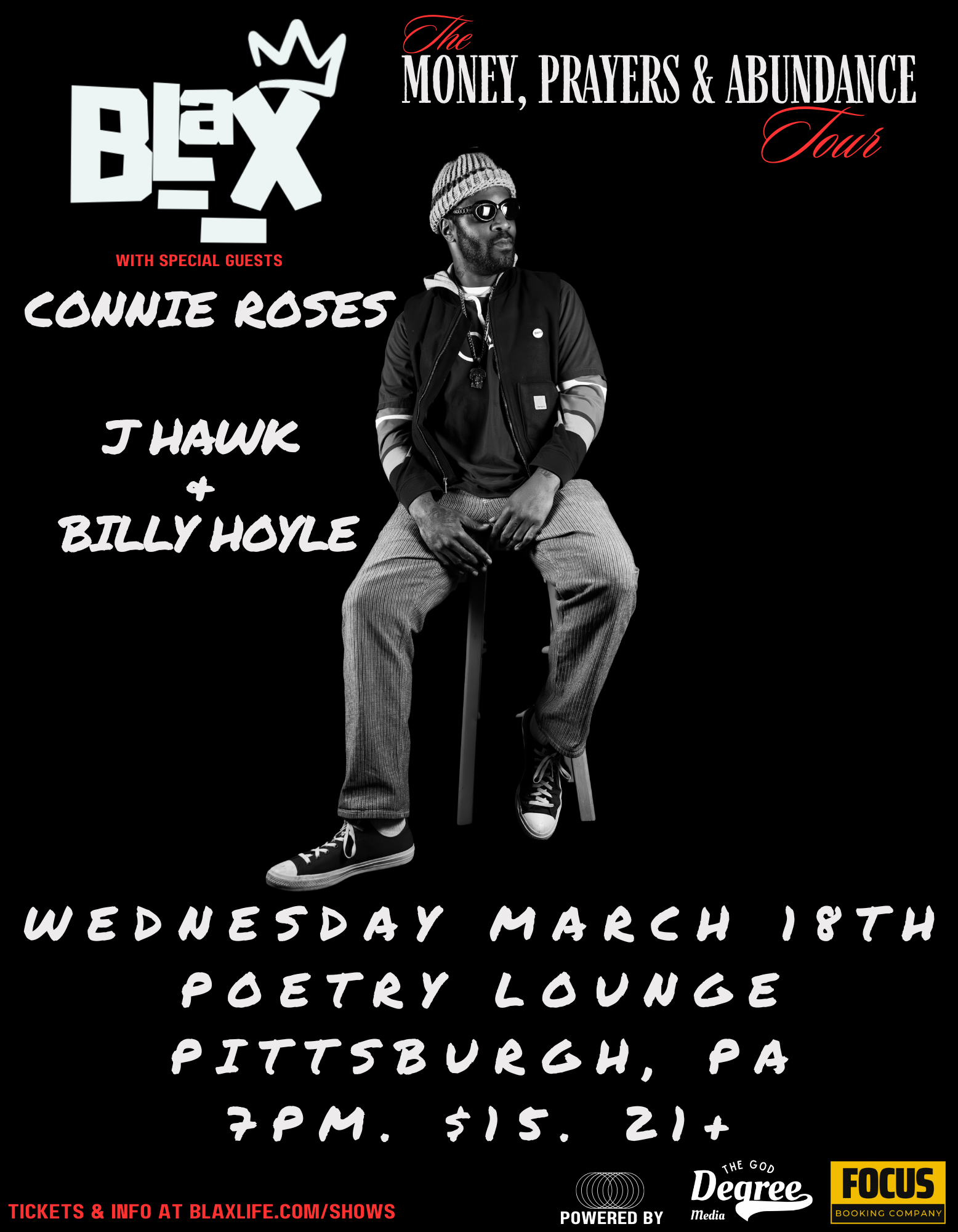 Pittsburgh’s Poetry Lounge hosts Milwaukee’s BLAX alongside Connie Roses for an intimate evening of conscious hip-hop. BLAX brings Omnipotent Methodology – 16 tracks blending jazz-infused production with street-level consciousness. With years of underground hip-hop experience, a 2018 WAMI Award, and features in major publications, BLAX represents independent artistry at its finest. Stop seven of the 15-city Money Prayers & Abundance Tour. Limited tour vinyl, CD, and cassette available.