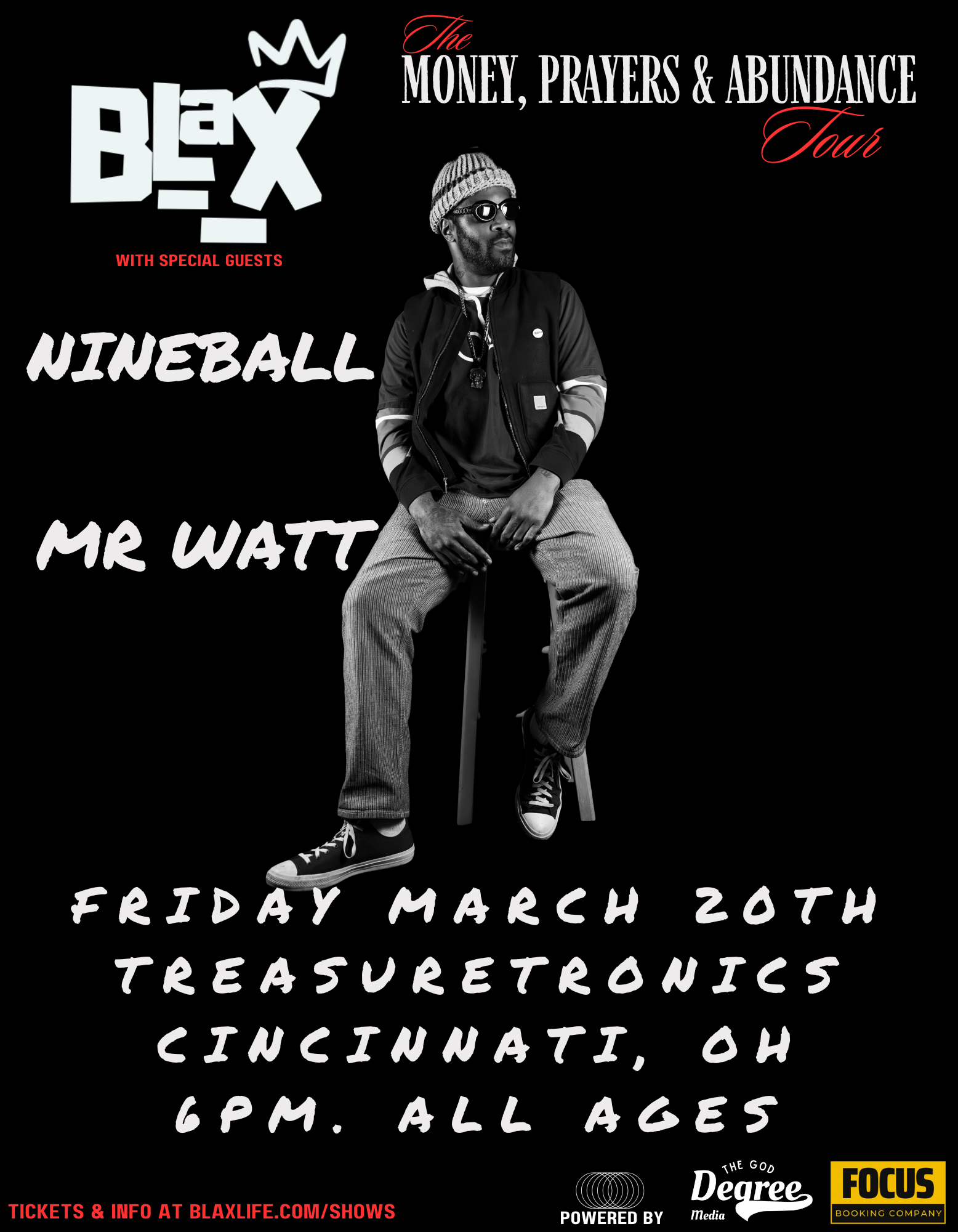 Cincinnati’s Treasuretronics hosts Milwaukee’s BLAX for a Friday night of conscious hip-hop. BLAX brings the Money Prayers & Abundance Tour to Ohio with Omnipotent Methodology – 16 tracks blending jazz, soul, and street consciousness. A 2018 WAMI Award winner featured in The Fader, The Source, and Respect Magazine. This independent artist owns all his masters and publishing through God Degree Media. Stop eight of 15 cities. Limited tour vinyl available.