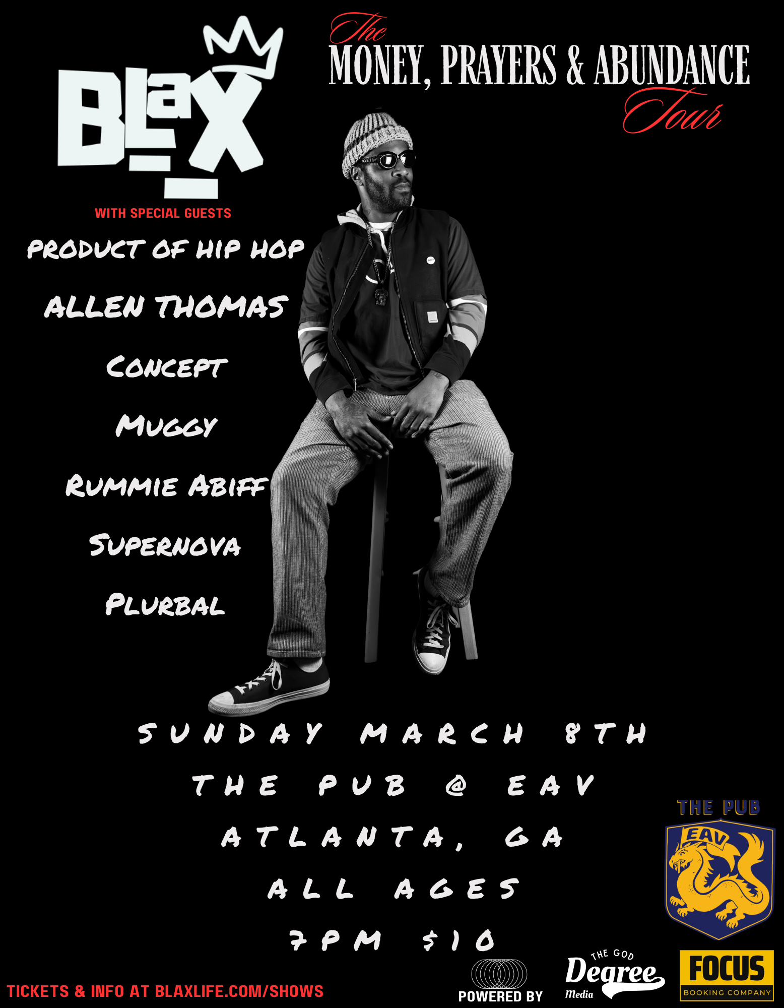 Milwaukee’s BLAX brings the Money Prayers & Abundance Tour to Atlanta with a stacked lineup of conscious hip-hop artists. BLAX’s new album Omnipotent Methodology blends jazz and soul with street-level awareness across 16 tracks. A 2018 WAMI Award winner featured in The Fader, The Source, and Respect Magazine, BLAX represents independent artistry at its finest. Stop two of 15 cities. Limited vinyl available. All ages welcome.